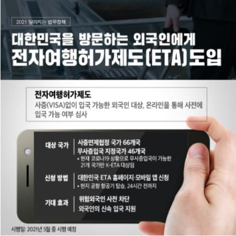 대한민국은 2021년부터 방문 외국인을 대상으로 전자여행허가제 K-ETA를 시행하고 있습니다.