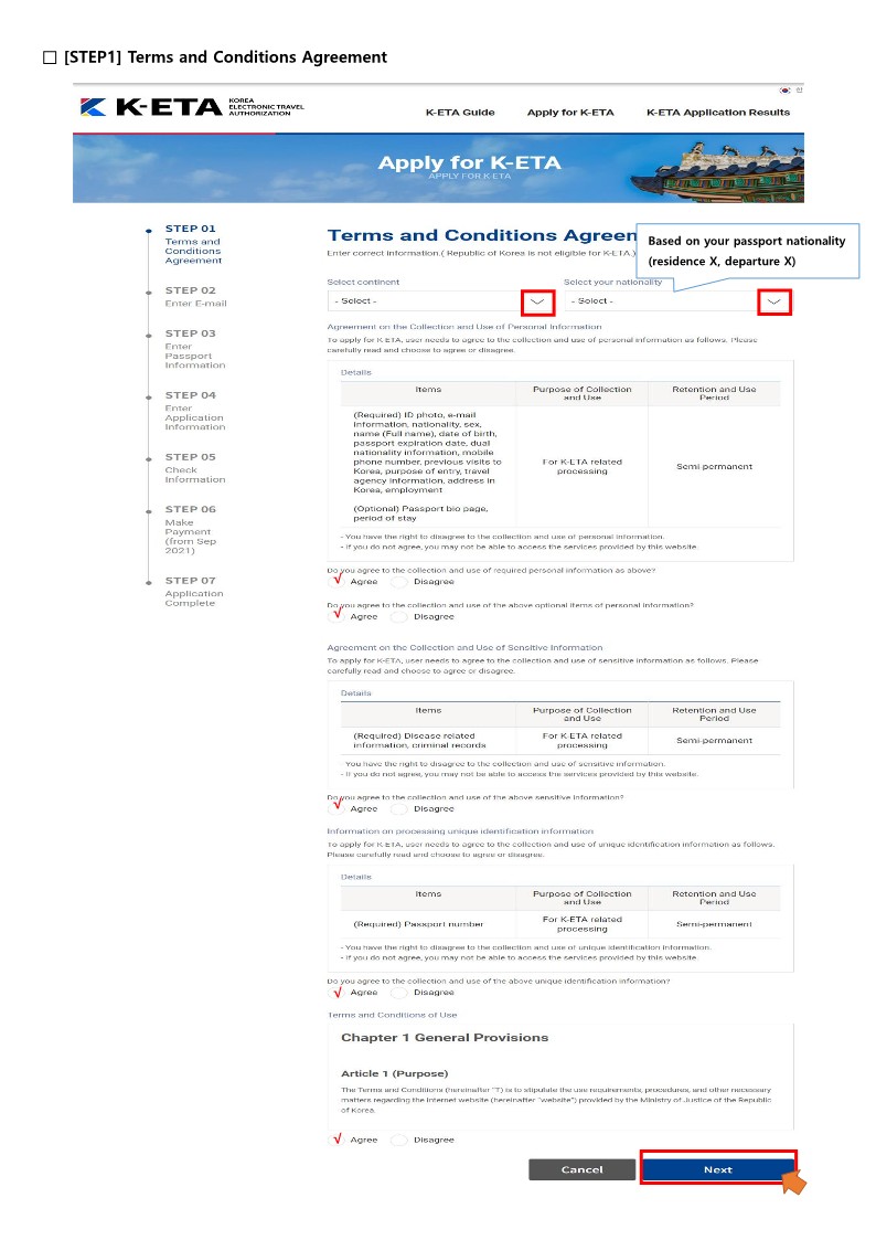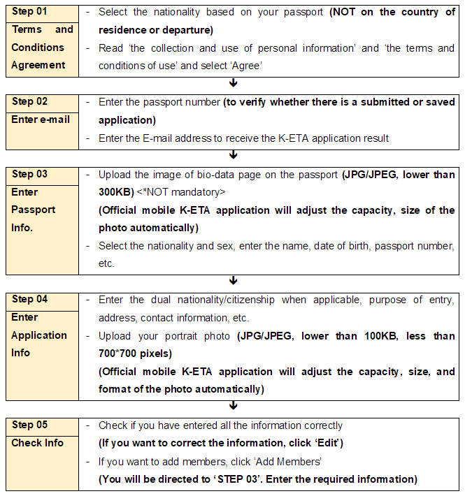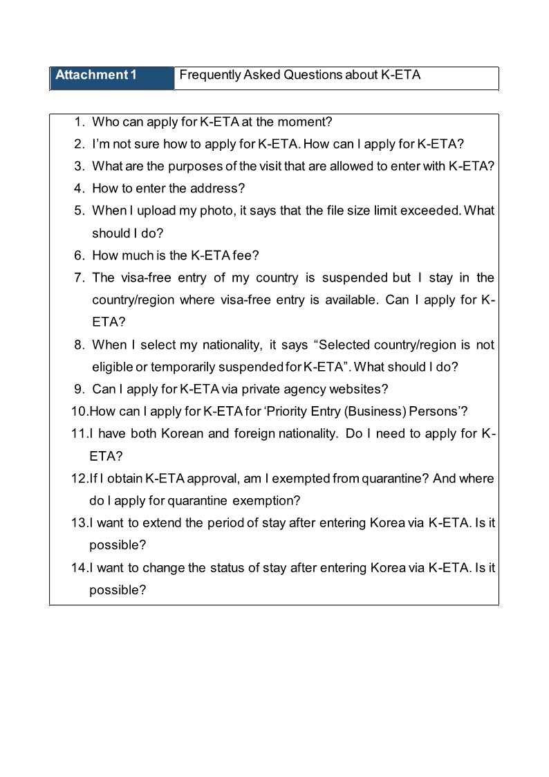 K-ETA(Korea Electronic Travel Authorization) is an online electronic travel authorization that visa-free foreign visitors need to obtain before entering the Republic of Korea for the purpose of tour, visiting relatives, participating in events or meetings, or business(excluding profit-making activities)