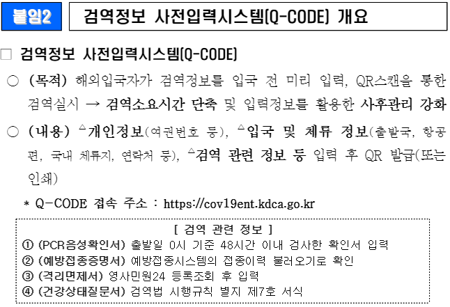 3월 21일부터 인천공항 도착 전체 노선에 사전입력시스템을 활용하여 입국 시 예방접종력 확인을 진행합니다. 입국 전에 PCR 음성확인서, 예방접종증명서, 격리면제서, 건강상태질문서를 입국자가 시스템을 통해 사전입력하여, 입국 소요시간과 절차를 단축하는 효과가 있습니다.